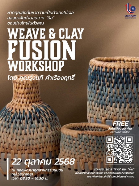 วันที่ 22 ตุลาคม 2568 สมาคมการค้าส่งเสริมหัตถกรรมไทย ร่วมกับ กองพัฒนาอุตสาหกรรมชุมชน กรมส่งเสริมอุตสาหกรรม จัดกิจกรรม “WEAVE & CLAY FUSION WORKSHOP – สาน + ปั้น”โดยได้รับเกียรติจาก คุณรุ่งนที คำเรืองฤทธิ์ เจ้าของแบรนด์ Linchawa มาร่วมถ่ายทอดเทคนิคการสานพื้นฐาน และการสร้างสรรค์งานปั้นผสมกับงานสาน กิจกรรมนี้จัดขึ้นเพื่อส่งเสริมการพัฒนาทักษะเชิงหัตถกรรม สร้างแรงบันดาลใจในการออกแบบ และต่อยอดภูมิปัญญาท้องถิ่นให้ร่วมสมัย สู่การพัฒนาผลิตภัณฑ์หัตถกรรมไทยที่มีมูลค่าและเอกลักษณ์ยิ่งขึ้น